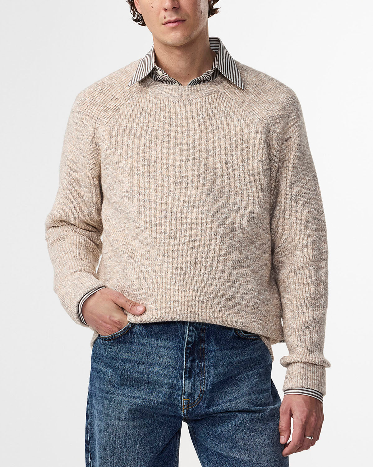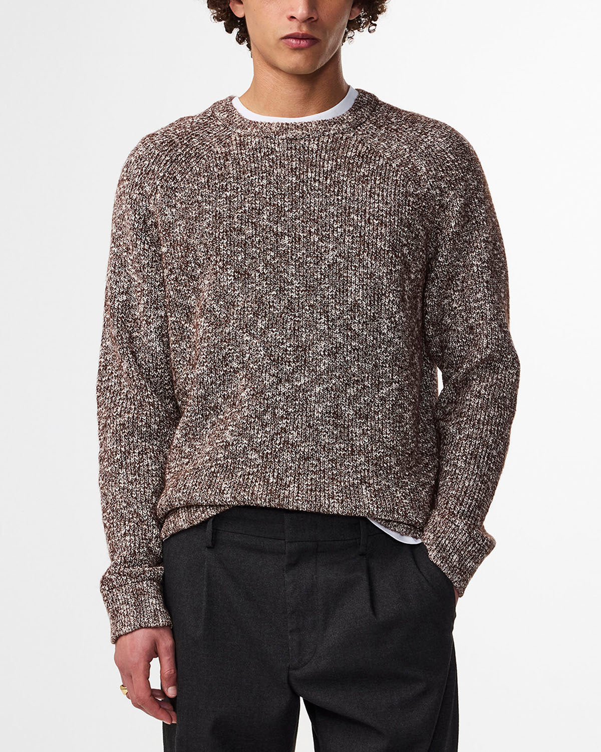 Crew neck sweater knit in a rib stitch, crafted in a cotton blend. This piece is made in boucle yarn and designed with a fine rib detail along the bottom and cuff.