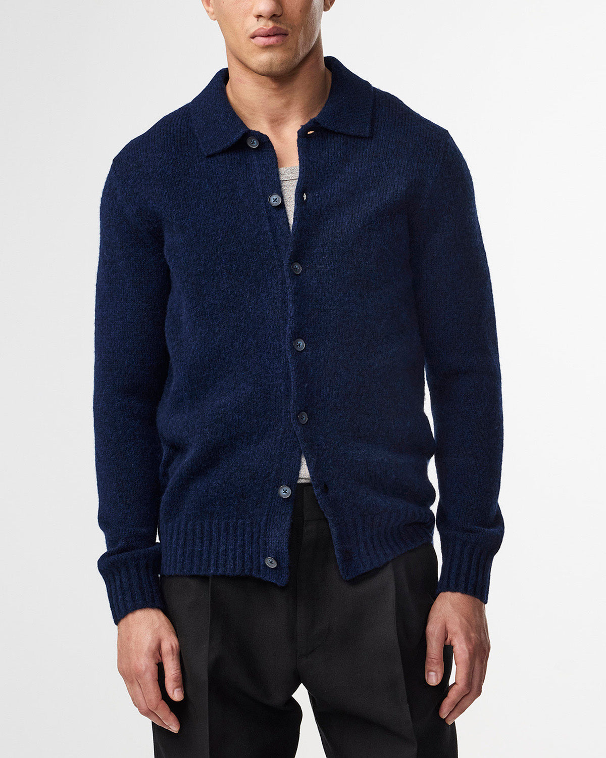 Polo cardigan crafted in a soft responsible wool blend. Knit in textured stitch and finished with Mother-of-Pearl buttons and a touch of stretch for extra comfort.