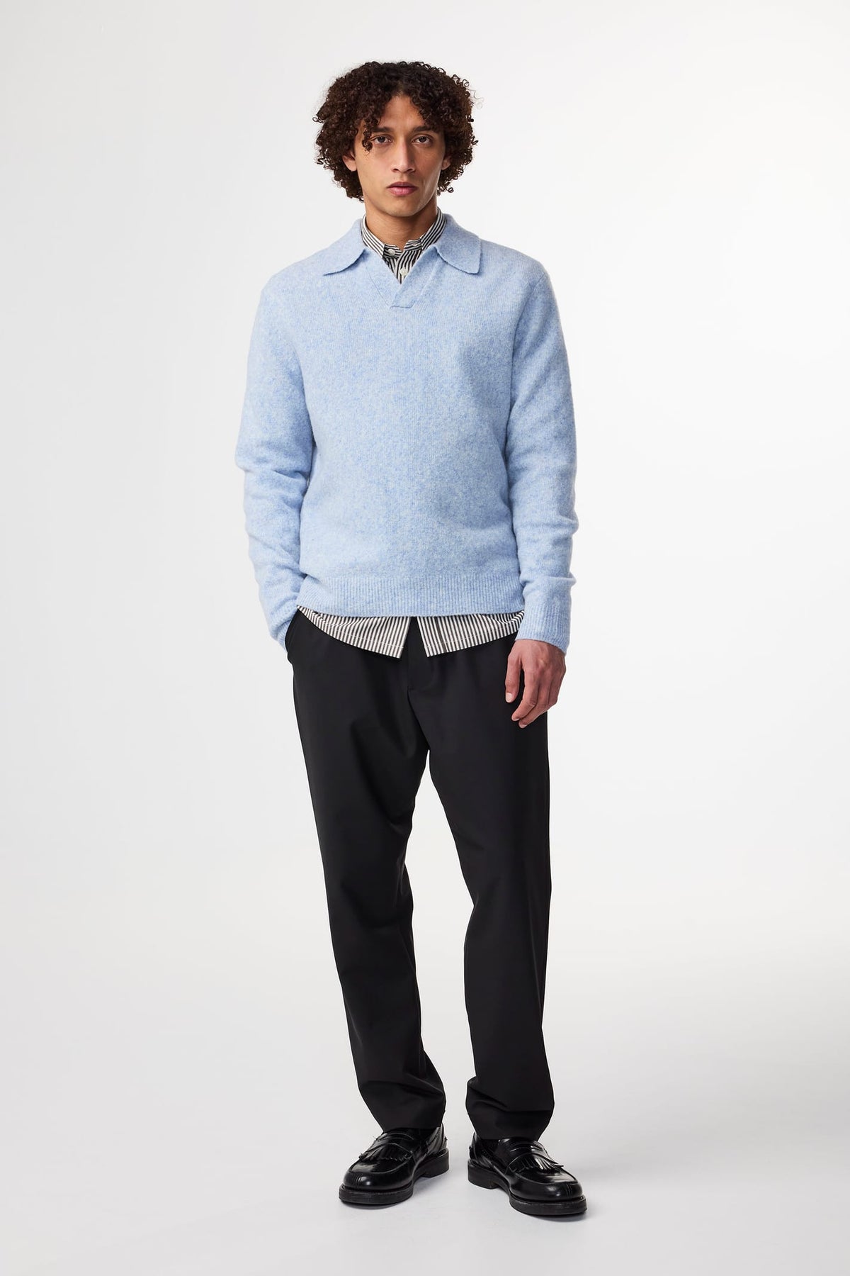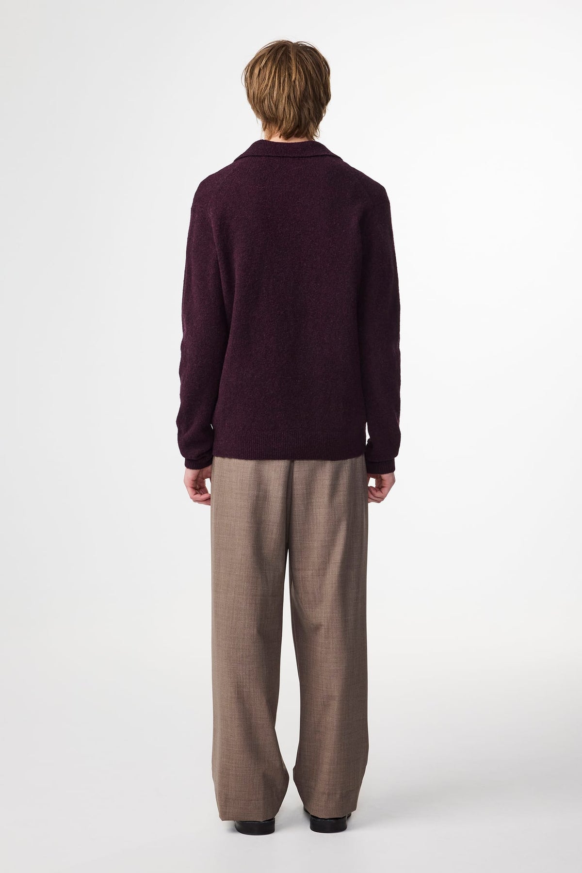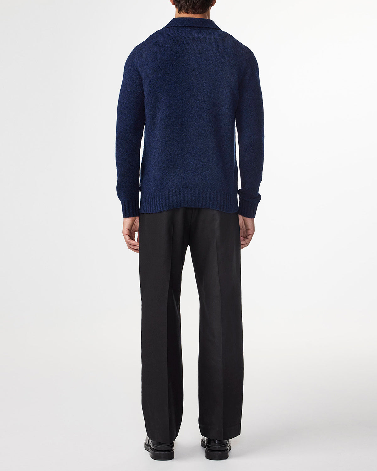 Bouclé polo knit crafted from an ultra-soft wool blend with added stretch for extra comfort. Designed with a fluffy texture and finished with a classic open polo collar.