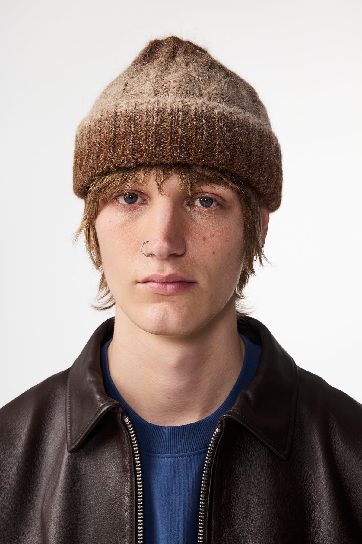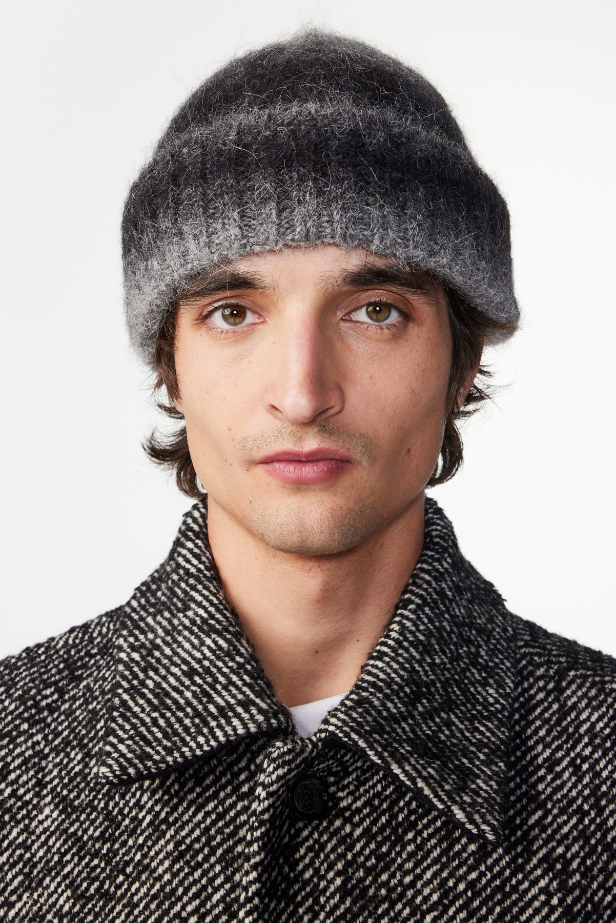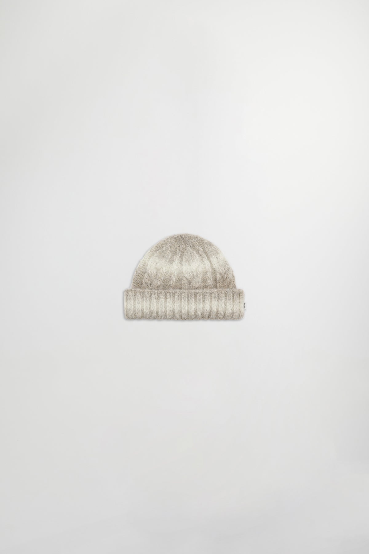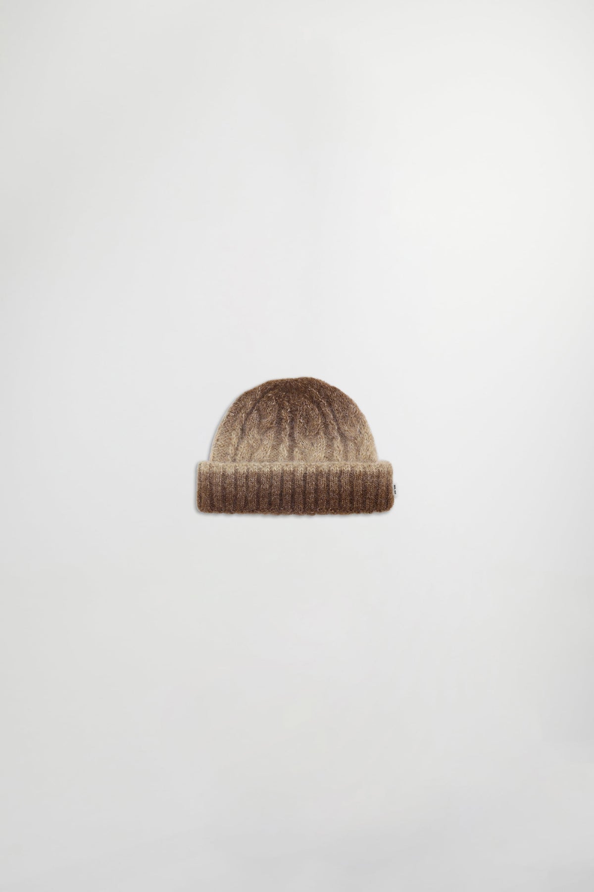 Extremely soft beanie crafted from a lightweight alpaca blend with recycled polyester. Features a gradient color and a fluffy, hairy finish. Each piece is uniquely textured.