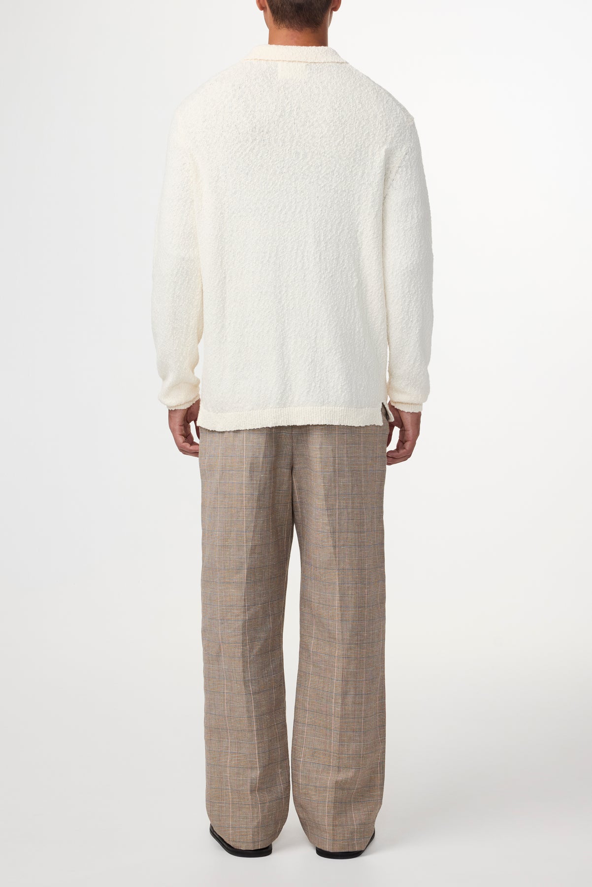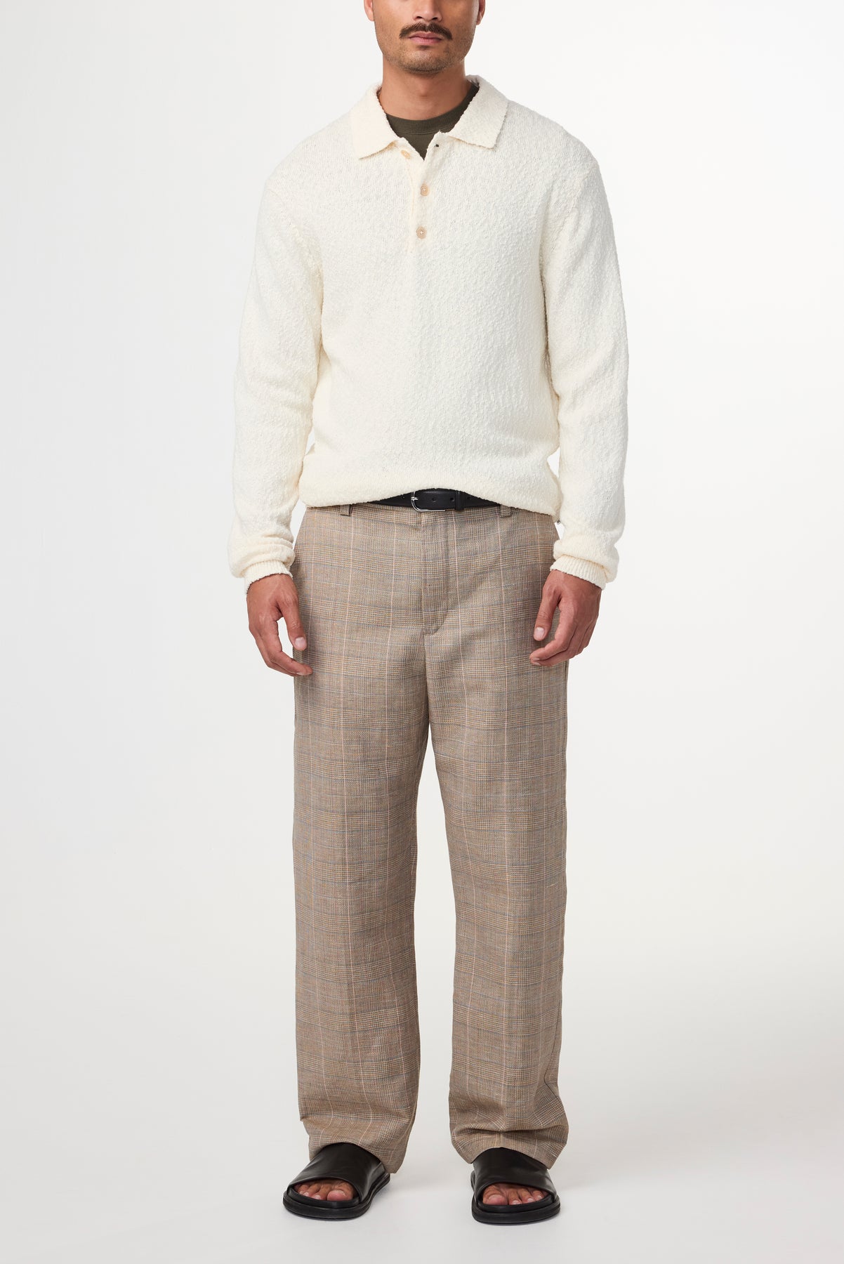 A pair of relaxed fit trousers crafted in a soft Prince of Wales check European linen and wool blend. Tailored with press folds, slanted side pockets, and dual back welt pockets.