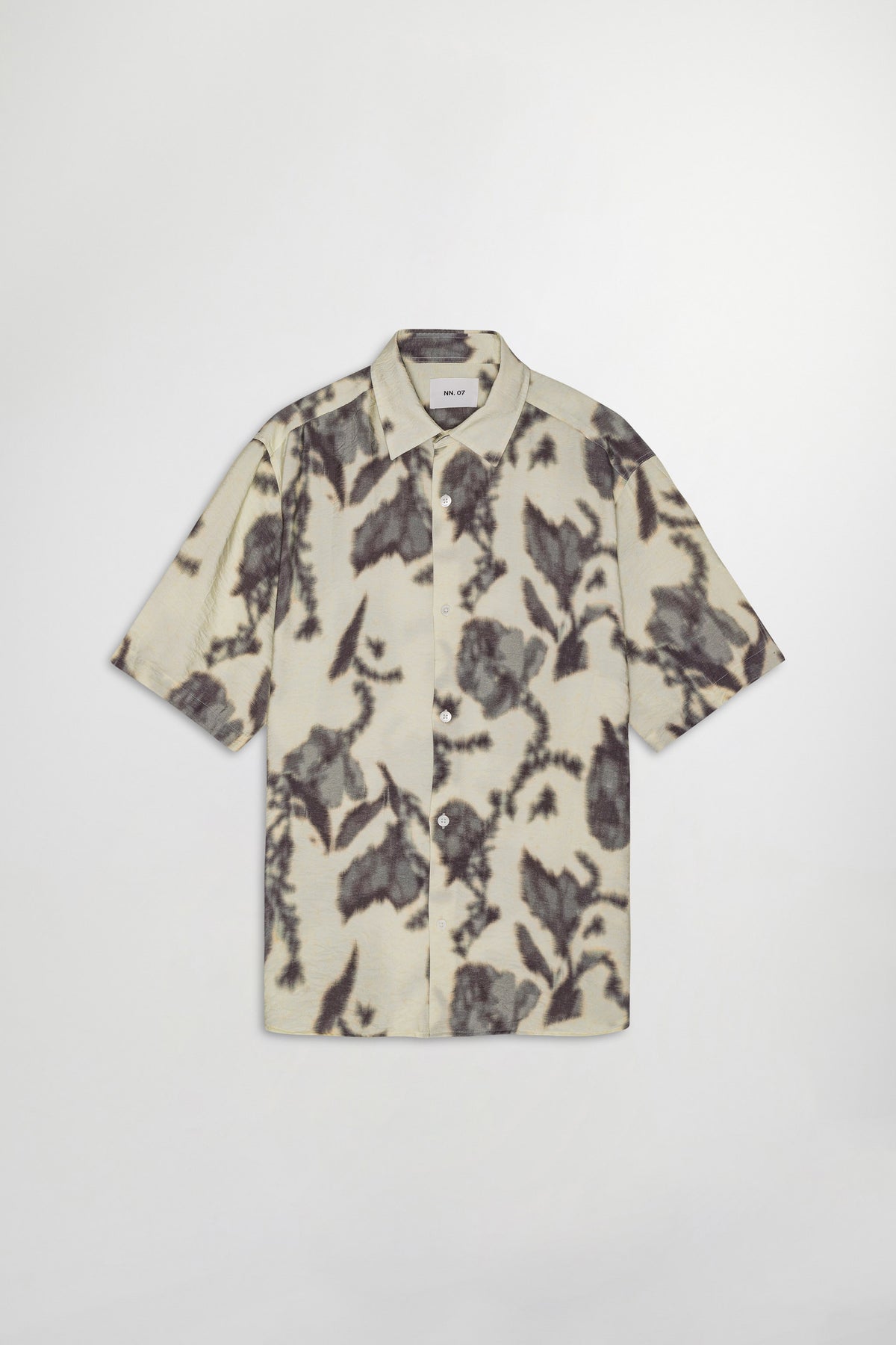 Relaxed fitted shirt crafted in a soft breathable linen and organic cotton blend with an open collar, complete with a raglan sleeve and dual side slits and a embroidery motive mirrored on either side of the front panels.